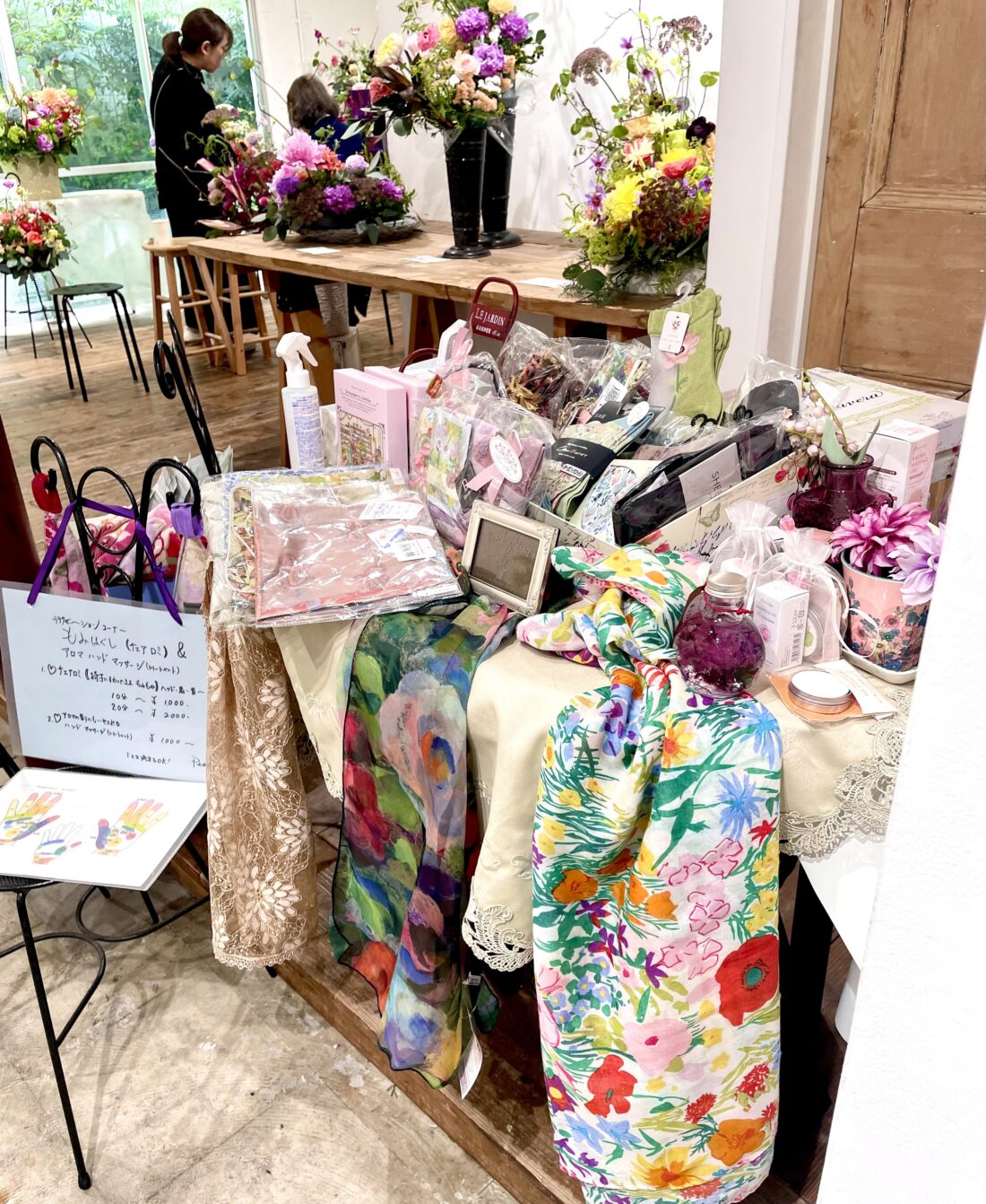 会期中Pearl Mint裏メニュー?とも言えるwork shopでお馴染みのもみもみコーナーと花と香りがテーマの小物やハーブティ等の販売も♪会員仲間のご家族やご友人〜ハンドマッサージご希望の方々♡使い易いスカーフ何枚もお買い求め、ハーブティのノンカフェイン➰パッケージが可愛いストロベリーガーデンも人気♪