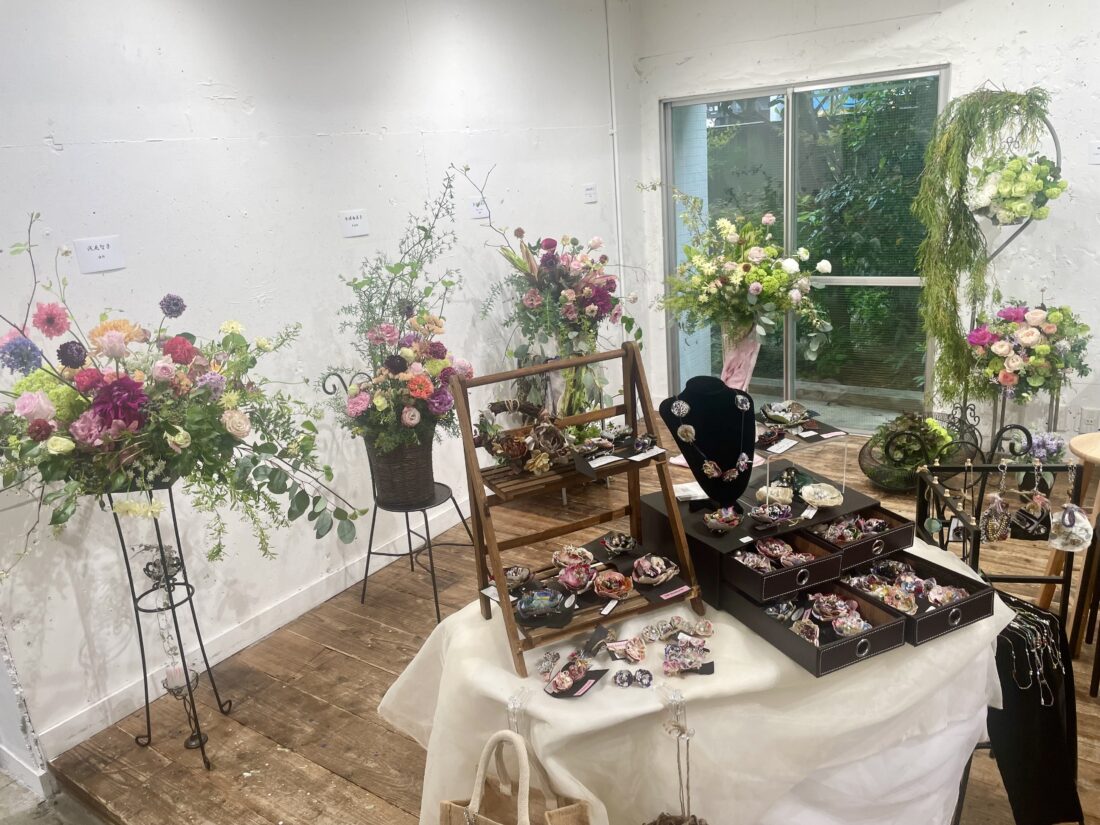 他➰素敵なアレンジメントも多数在る中、上田氏とbelleflowers-yumi のデザイン&制作の布花コサージュに人だかり➰メインのオリジナルコサージュやバッグコサージュ、新種デザインの数々も並び一目を惹きました♡他workshop としてタロット占いや最終日には手作りアクセサリーにも人気が沸騰していました♪